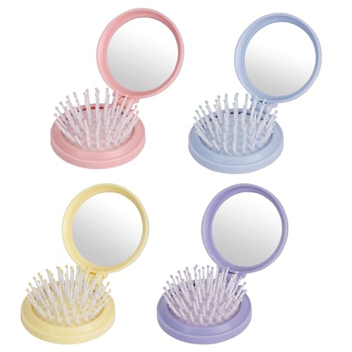 LIUCONGBD 4 stycken vikbara hårborstar med spegel, runda mini hårkammar, bärbar hopfällbar borste för kvinnor och män, resestorlek hårmassage kam (rosa + blå + lila + gul)