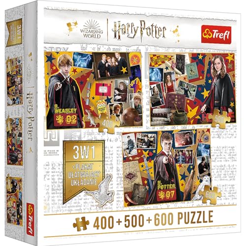 Trefl – 4-i-1 pussel, set med 3 pussel 400+500+600: Ron, Hermione, Harry + affisch – Harry Potter-hjältar pussel, 400 500 och 600 stycken, A4-affisch, för vuxna och barn från 10 år