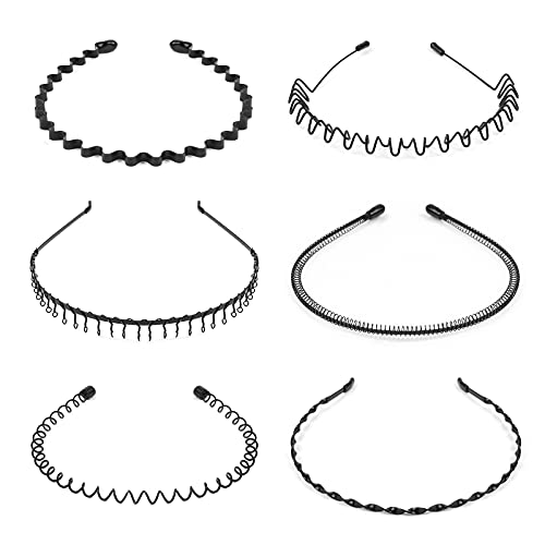 URAQT metalldiadem unisex, 6 stycken vågiga diadem i multistil, pannband tillbehör, kvinnor och män, halkfria elastiska diadem, hårsmycken för utomhus sport yoga, svart