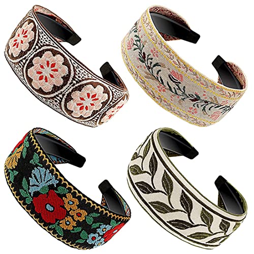 4 stycken boho-pannband handgjort broderi bohemiska blommor breda pannband vintage etnisk stil hårband för kvinnor flickor hårsmycken