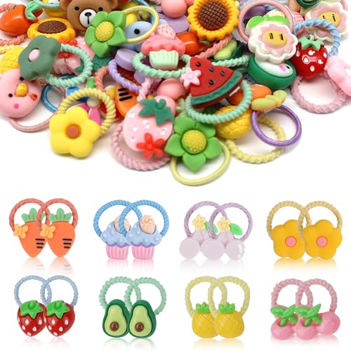 Calkkrer 60 stycken färgglada hårsnoddar – elastiskt flätgummi för flickor, spädbarn och barn – med blommor och fruktmotiv – hästsvans hårsnodd set