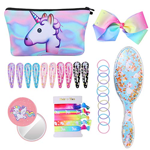 HIFOT Enhörning hårborstar våt borste med makeupväska hårtillbehör set för flickor utklädning Kawaii färgglada hårband regnbåge rosett hårspänne hårnålar spegel för barn tonåringar kvinnor
