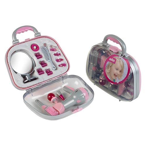 Theo Klein 5855 frisörväska med Braun hårtork | Med spegel, kam och många stylingtillbehör | Tålig väska med batteridriven hårtork | Mått: 27,5 cm x 11 cm x 22,2 cm | Leksak för barn från 3 år