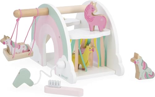 Janod J08591 Trähus tema FSC träleksaker – innehåller 6 tillbehör: 4 enhörningar, 1 hårtork, 1 borste, 1 gunga, 1 rutschkana från 18 månader – J08591