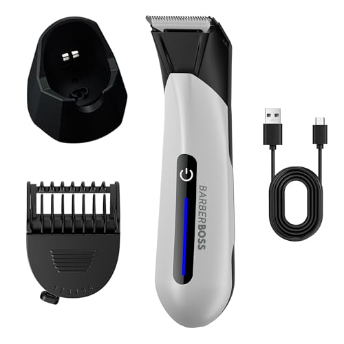 BarberBoss Hårtrimmer för män, vattentät ljumsk och bollgroomer, hudvänligt keramiskt blad, kamma med justerbar längd, USB-laddningsstativ och LED-ljus, manlig hygien rakapparat (vit)