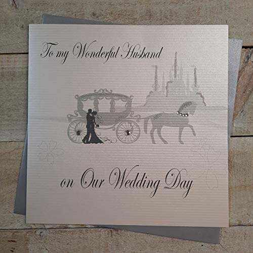 Vita bomullskort till min underbara make, handgjort stort bröllopskort (häst och vagn)