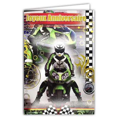 AFIE 67-1014/1 Grattis på födelsedagen guld guld glänsande grön motorcykel för pojke herr med vitt kuvert 12 x 17,5 cm biker hjälm tävlingsräknare hastighetsmätare bana flagga Damier mästerskap