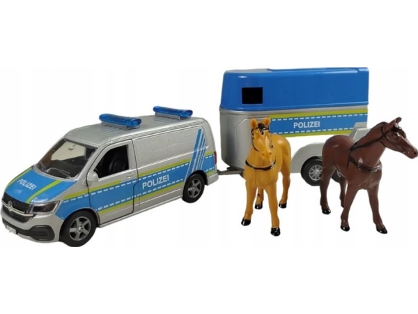 Kids Globe VW Transporter polis med hästsläp Cast Pull Back 28 cm, leksak för barn, 520359