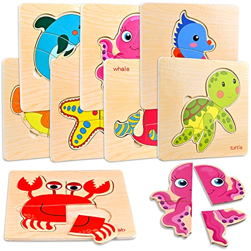 Faburo Träpussel, 8 st träpussel Montessori-leksaker, träleksaker från 1 2 3 år, träleksak pussel från 2 3 4 år, pusselgåva havsdjur, träpussel för baby och småbarn