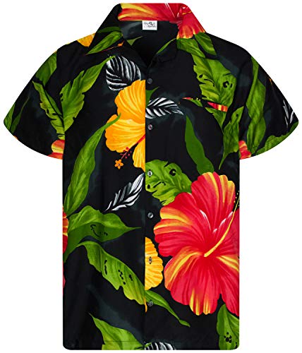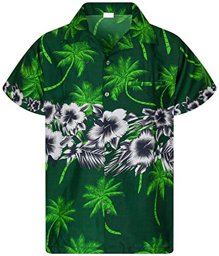 King Kameha Funky Hawaii-skjorta för män, kortärmad, frontficka, Hawaii-tryck, blommor, brösttryck, Grön, XXL