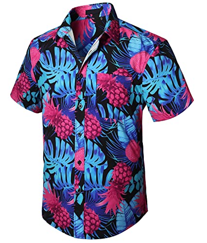 Enlision Funky Hawaii-skjorta för män, kortärmad, fritid, Hawaii-skjorta, tryck, ananas palmer, blommor, ledig, unisex, Hawaii-skjorta med framficka, S-2XL, A-rosa och blå, M