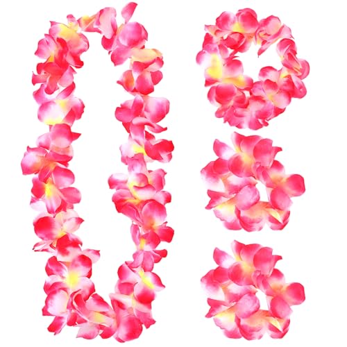 4 stycken färgglada Hawaiianska kransar, kransar med volanger konstgjorda Hawaii-blommor halsband, hårband, girlang-set för vuxna, strandfesttillbehör (rosa)