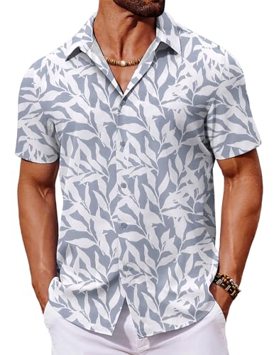 COOFANDY Skjorta för män, kortärmad, Hawaii-skjorta, sommar, strandskjorta, semester, Hawaii-skjorta, blommor, skjortor, Aloha herrskjortor, Palmblad blå och vita, XL