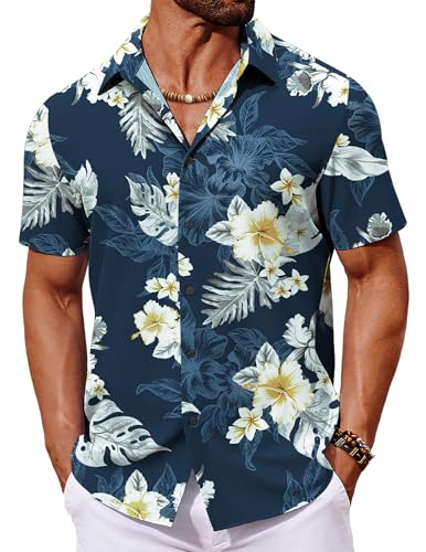 COOFANDY Hawaii-skjorta, herrskjorta, kortärmad sommarskjorta, män, fritidsskjortor, blommor, semester, strandskjorta, normal passform, Marinblå blomma, S