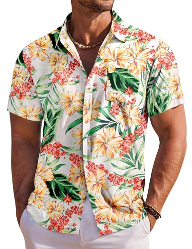 COOFANDY Hawaii-skjorta, herrskjorta, kortärmad sommarskjorta, män, fritidsskjortor, blommor, semester, strandskjorta, normal passform, Vit blomma, XXL