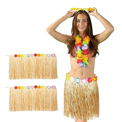 FEPITO 1 set hawaiianskt gräs rockkjol med blomma Leis halsband pannband armband klänning kostym set för flickor kvinnor Luau Hawaii danskjol festgåvor