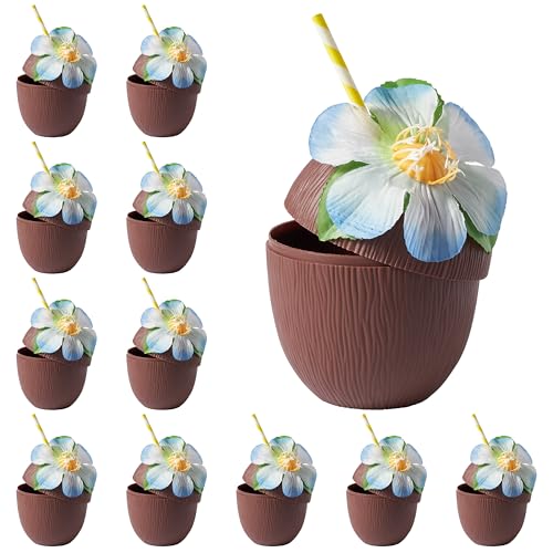 THE TWIDDLERS 12 återanvändbara kokosnötsmuggar av plast med blommor och papperssugrör - för trädgård, pool och strand - Tiki Bar, Luau-fest med Hawaii-tema, tropiskt bröllop