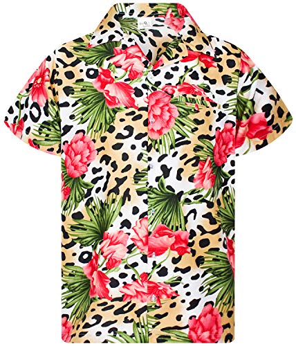 King Kameha funky Hawaii-skjorta för män, kortärmad, frontficka, Hawaii-tryck, leopard, blommor, Leopard blommor beige natur, L