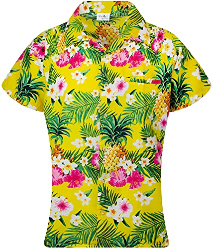 King Kameha Funky Hawaii-blus/-skjorta för damer, kortärmad, frontficka, Hawaii-tryck, ananas, palmer och blommor, L