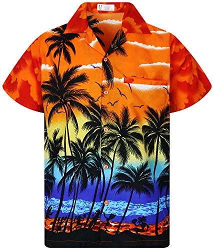 V.H.O. Funky Hawaii-skjorta för män, kortärmad med frontficka och Hawaii-tryck: strand, palmer och olika färger, Orange, 3XL
