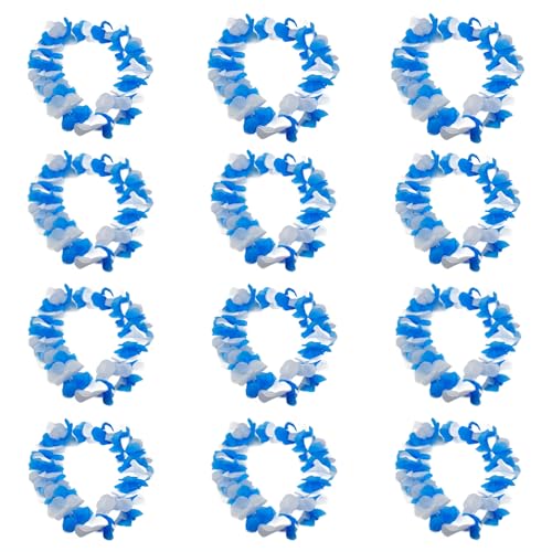 12 stycken Hawaii-kedja, blomkedja, vit-blå med 30 stora blommor – strandfest, karneval, temafest, sommar, bröllop, födelsedag, Satin blommor