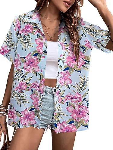 MYHALF Women Hawaiian Shirt Soft Cool Summer Hawaii Shirts Floral Tropic Print V Neck T-Shirt Short Sleeve Button Up Tops