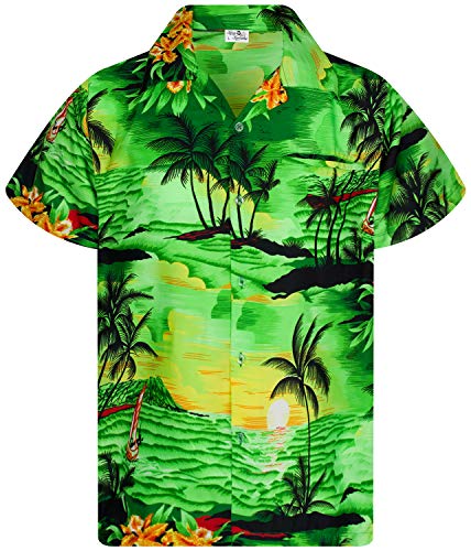 King Kameha Funky hawaiiskjorta herr, kortärmad, framficka, hawaiitryck, strandsurftryck, Surf grön, L