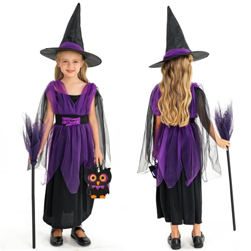 BARVERE Flicka häxdräkt, häxklänning, färgklänning med häxhatt, kvasthandtag och ugglaväska för barn (storlek: 130)