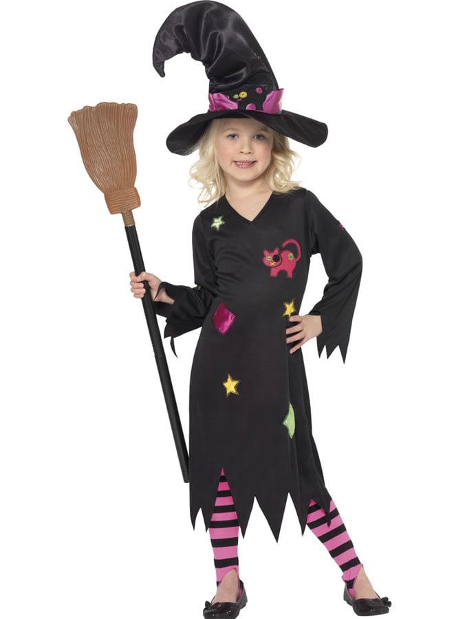 Spooktacular Creations Flicka häxdräkt, rosa lysande stjärna häxklänning med hatt och kvast för barn, småbarn, halloweenklänning, rollspel