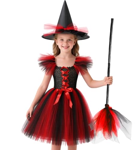 HarnyLoom Häxdräkt för barn flickor, häxdräkt, häxklänning, tutu med häxhatt häxkvast, halloweenkostym barn, karneval (röd, 110 (4–5 år))