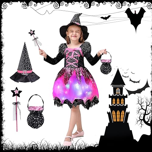 BGIUSQF Häxdräkt barn, LED-häxklänning barn, Halloween-glödande häxklänningsset, ta med hatt, väska och trollstav, Halloween-dräkt häxflicka, 130 cm