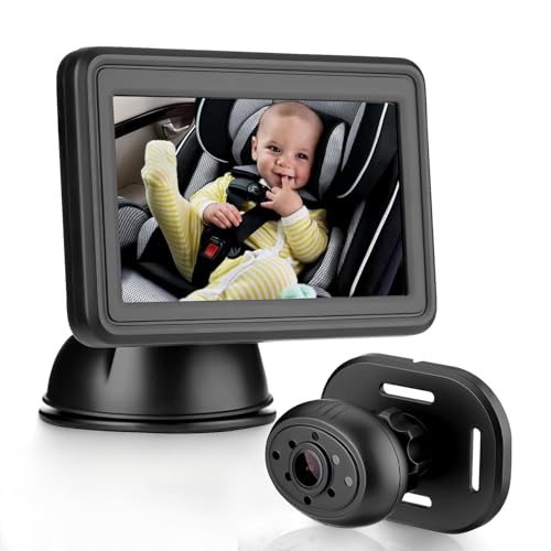 IPOZITO Babybilkamera med dubbla kameror, HD 1080P dubbla kanaler 5 tums skärm bil babykamera, installera enkelt bilkamera för baby med kristallklar bred vy för bakåtvänd säte