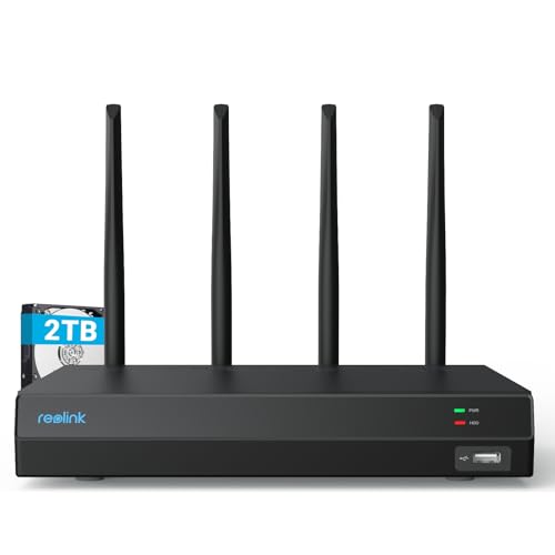 Reolink 4K 12CH Wi-Fi 6 NVR, inbyggd 2TB HDD, expanderbar till 16TB, 2,4/5 GHz Dual-Band WiFi, stöd för 12MP/8MP HD Reolink IP-kameror, 24/7 inspelning för hemmets säkerhetskamerasystem, RLN12W