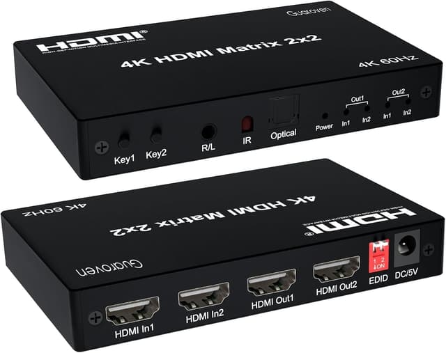 PORTTA HDMI Matrix 4 i 2 ut 4K 60Hz 4: 4: 4, 4x2 Switch Splitter med optisk 3,5 mm ljudextraktor, 16 EDID -lägen, IR -fjärrstöd HDMI 2.0B, HDCP 2.2/2.3, HDR, ARC, 3D, 18GBPS - Downscaleraler