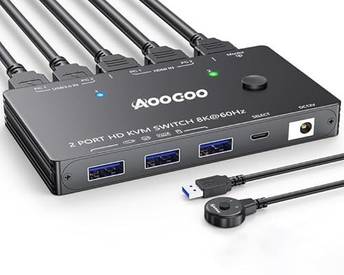 KVM-switch för 2 datorer och 1 x 8K till 60 Hz/4K vid 120 Hz HDMI KVM-switchar med trådbunden fjärrkontroll, strömförsörjning och USB 3.0-kabel ingår