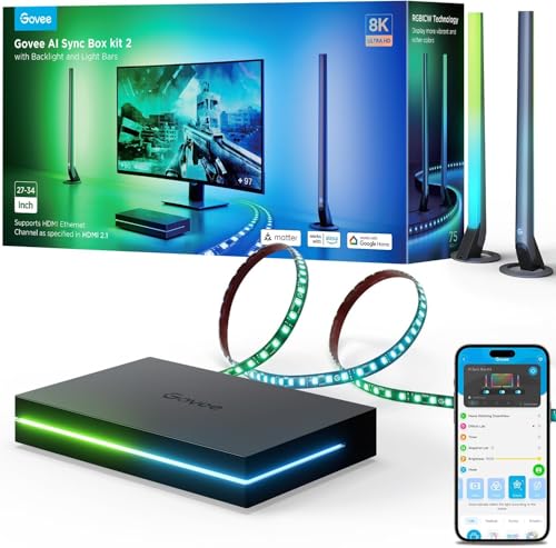 Govee HDMI 2.1 Sync Box Kit 2, med ljusstång och LED-remsa, stöder 8K@60Hz, 4K@144Hz, VRR och ALLM, fungerar med Matter och Alexa, bildskärmsbakgrundsbelysning för 27–34 tum