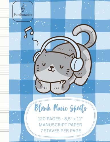 PureNotation: Blank Music Sheets, 120 pages - 8,5" x 11", Manuscript Paper, 7 Staves per Page: Wide Staff Paper for Kids, Cream Paper, Blue Headphone-wearing Cat Design