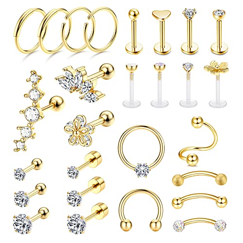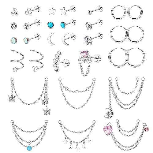 Morfetto 33 st rostfritt stål broskörhängen set CZ måne stjärna hjärta fjäril platt baksida helix knoppörhängen små huggie ring örhänge kedja hängande tragus brosk helix piercing smycken 20 g,