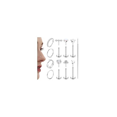 JeweBella 9 st 16 g näsringar, kirurgiskt stål, septum, piercing, broskörhängen, dam, CZ opal piercingar, helix tragus, silverläppar, näsringar, Conch Daith Piercing, smycken, 8/10 mm, Rostfritt stål