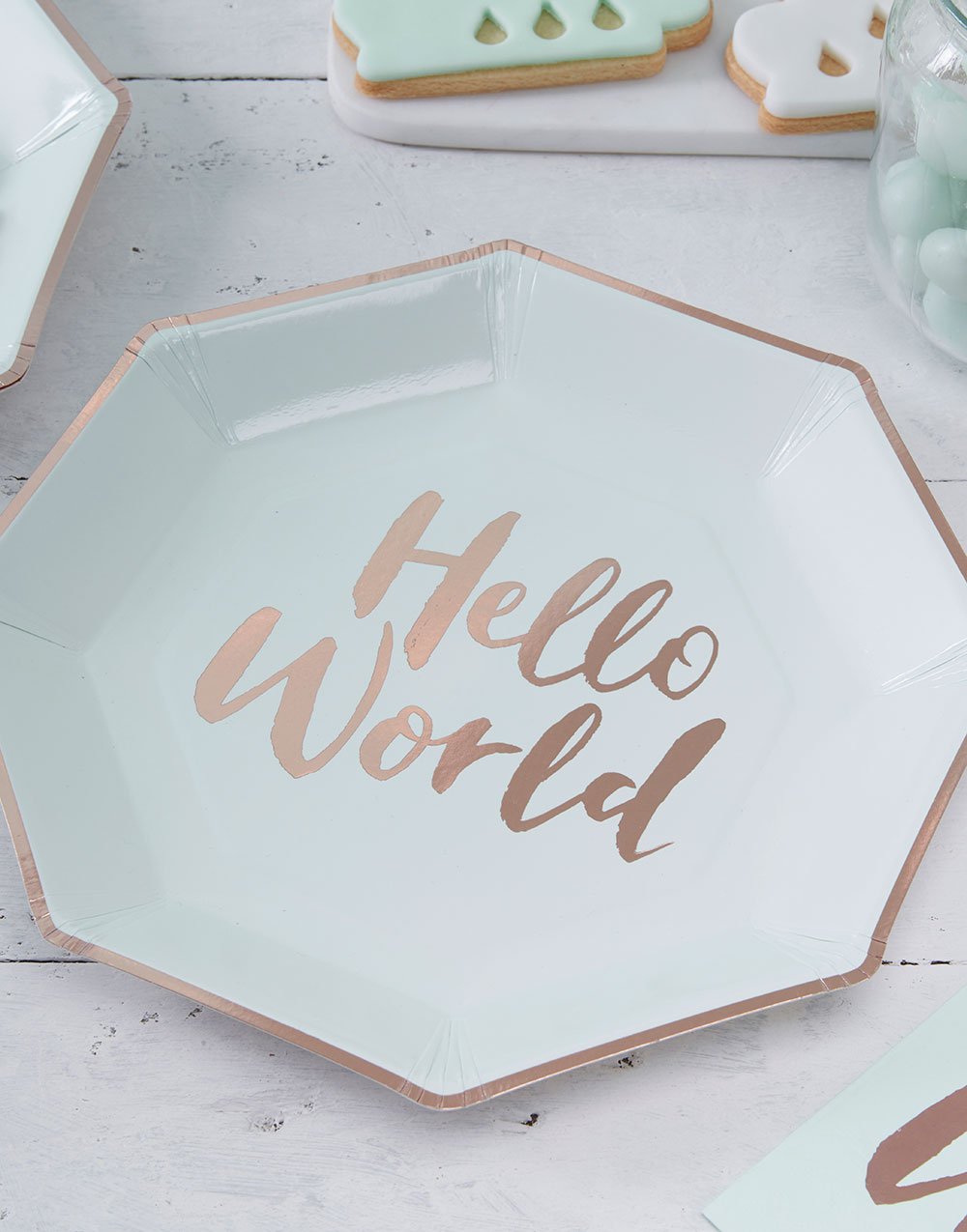 8 stk Mintgröna Papptallrikar med Folierade Guldfärgad Text 25 cm - Hello World