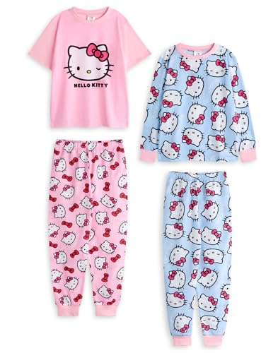 Hello Kitty Girls Pyjamas Set Pack of 2 | Barn blå & rosa Kitty Vit grafisk kortärmad topp & långa ben PJ Bottoms | Barnkattungekaraktär All Over Print Nattkläder | Sanrio Cartoon Merchandise