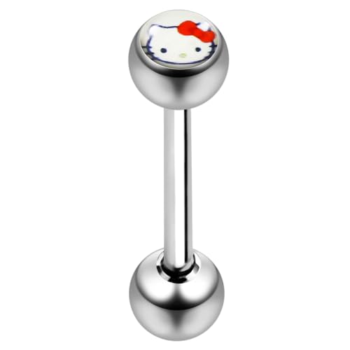 AZARIO LONDON Hello Kitty logo boll med 14 mätare rostfritt stål rak skivstång med boll tungstav piercing smycken, 14mm Length, Logoboll, Ingen ädelsten