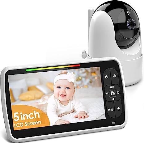 Cankypu Babymonitor med kamera och ljud, 5 tums skärm, helt fjärrstyrd/lutbar babykamera, 3000mAh mörkerseende, batteritid, trådlös babyvideomonitor