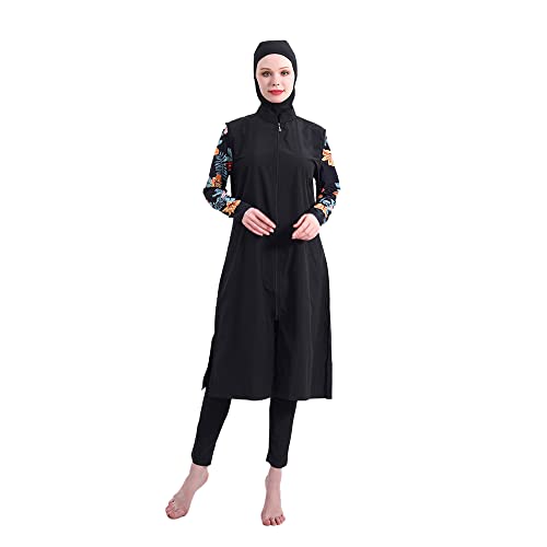 ABEUTY Baddräkt för damer muslimsk heldräkt plusstorlek långärmad burkini-tryck avtagbar hijab heltäckande blygsamma badkläder, Svart, XL
