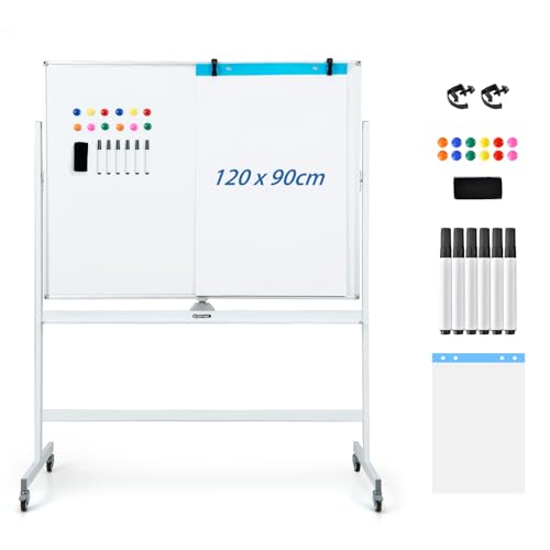 GOPLUS magnetisk whiteboard med stativ, dubbelsidig whiteboard med tillbehörsset, torr avtorkningsbar, mobil skrivtavla höjdjusterbar, för skola, kontor, hem (120 x 90 cm, vit)