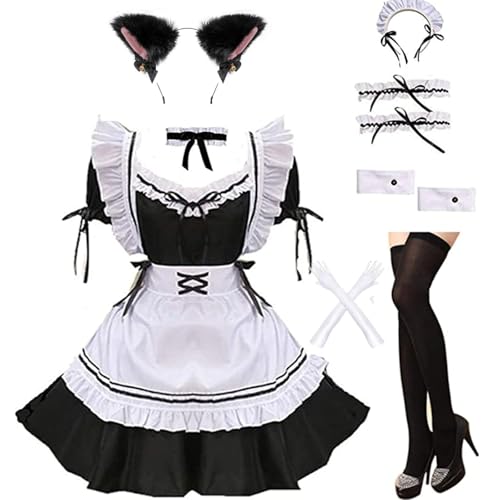 MAYAIO Anime Fransk Sissy hembiträde förkläde Lolita maskeraduniform cosplay kostym lurvig katt öron handskar strumpor fullt set (X-Large svart)