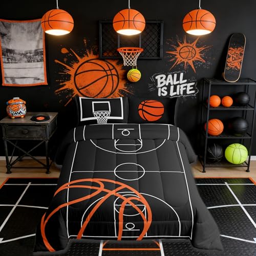 Basketbana tryck sängkläder set för pojkar flickor, boll sportspel tema alla årstider mysigt täcke set full storlek, orange basket och ring täcke set heminredning, barn födelsedagspresent