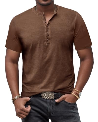 YawYews Långärmad T-shirt för herr Henley långärmad t-shirt för herr slim fit bomull för herr M-3XL, Kortärmad brun, XXL