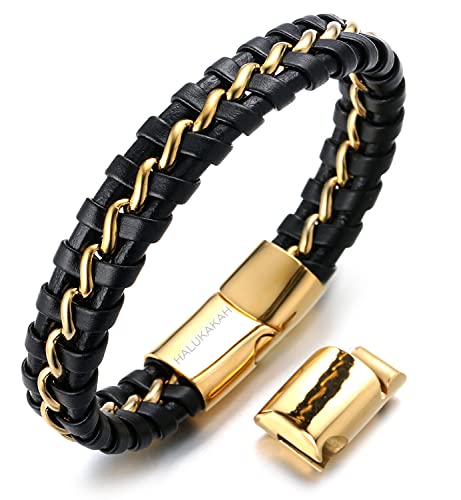 HALUKAKAH Plus ● Heder Guld ● Herr Armband av Äkta Läder Titan Magnetlås Storlek Justerbar 8.5"-9"(21.5-23cm) Svart och Gyllene med Gratis Presentbox