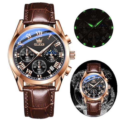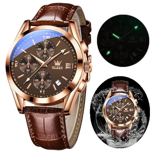 OLEVS Kvarts kronograf klocka för män, läderband, guldfodral med datum, rostfritt stålklocka, herrklocka, mode, avslappnad, G2871-svart urtavla med brunt band, rem